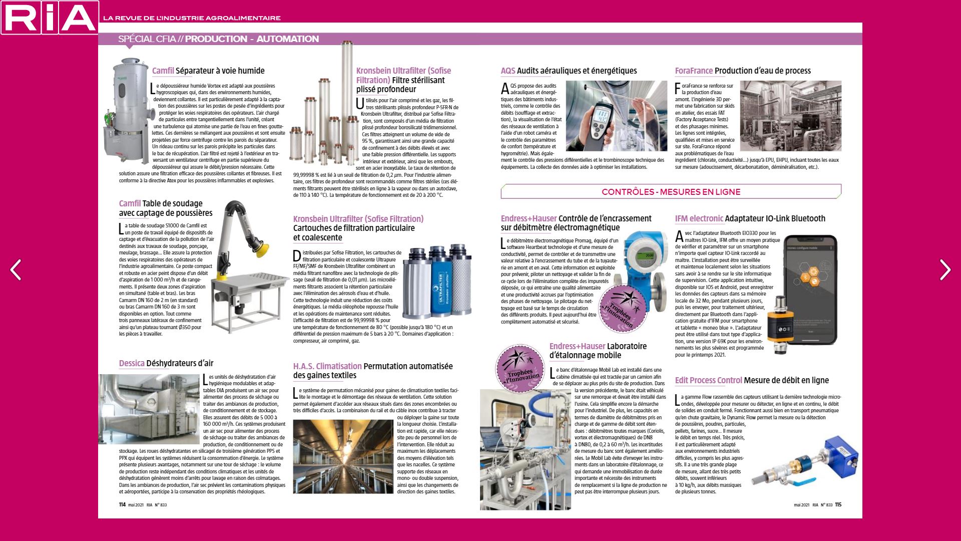 Merci à la Revue de l’Industrie Agroalimentaire (RIA) d’avoir mis en avant nos unités de déshydratation et séchage spécialement conçues pour l’agroalimentaire, dans son numéro 833 de Mai 2021 Spécial CFIA 2021